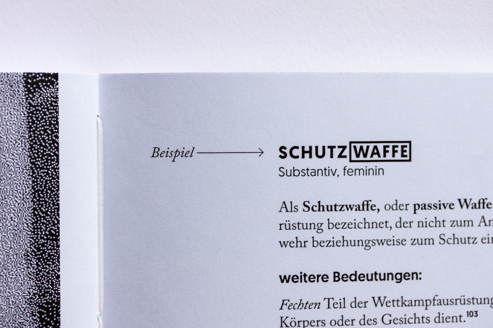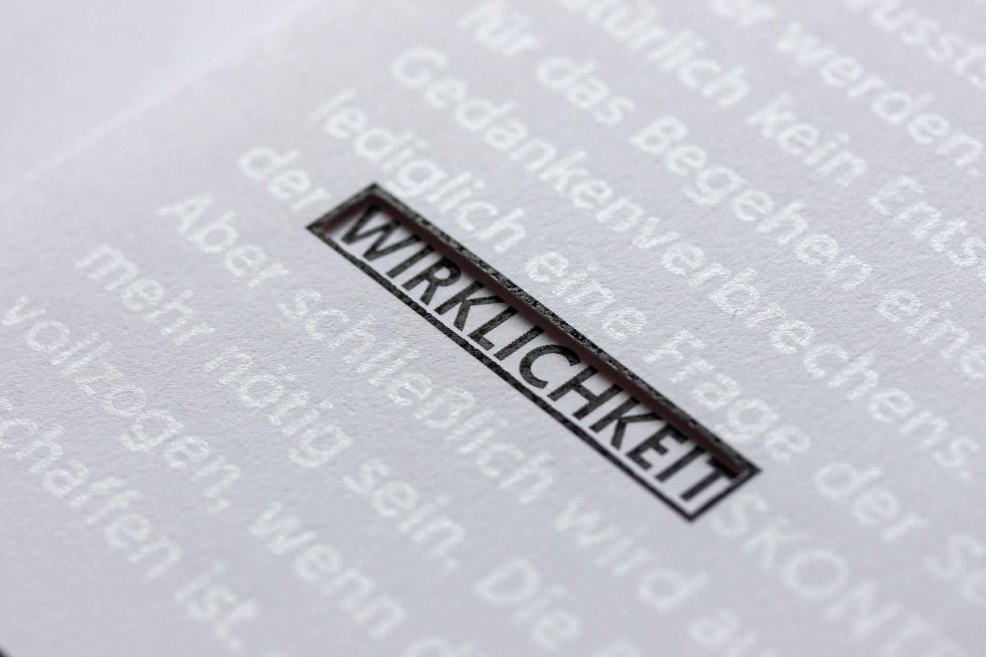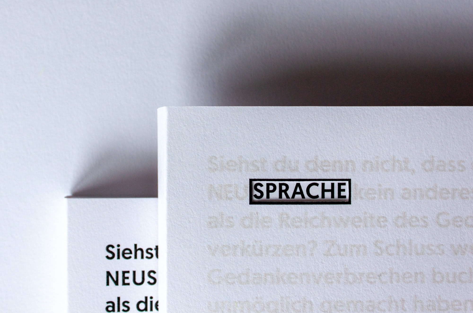 The book’s slipcase displays a quote from 1984 about Newspeak. Due to the use of interference paint most of the quote is barely readable, except for the three highlighted words, visible through framed windows, comprising the title. Once the case is removed, the full quote can be read.