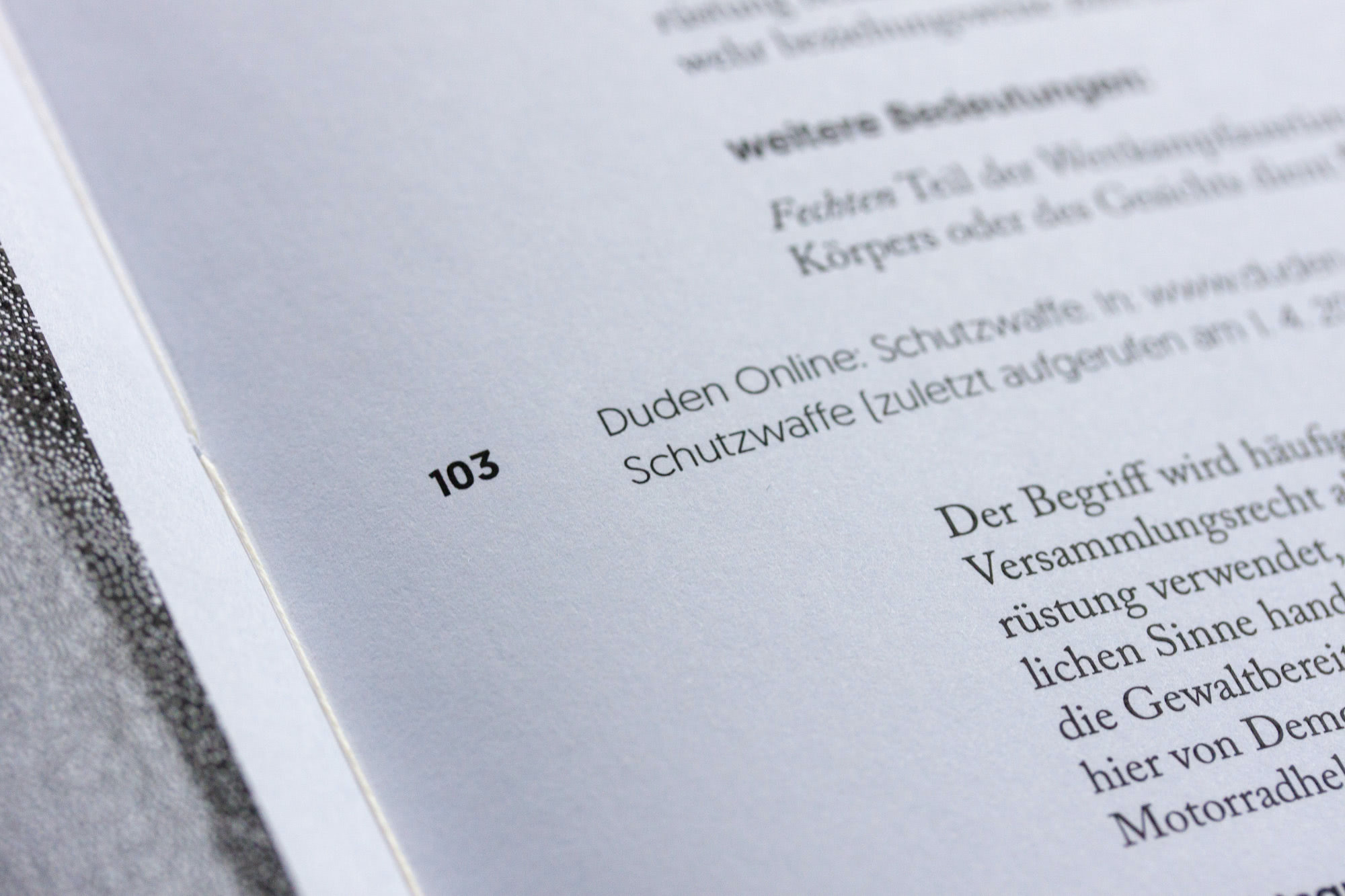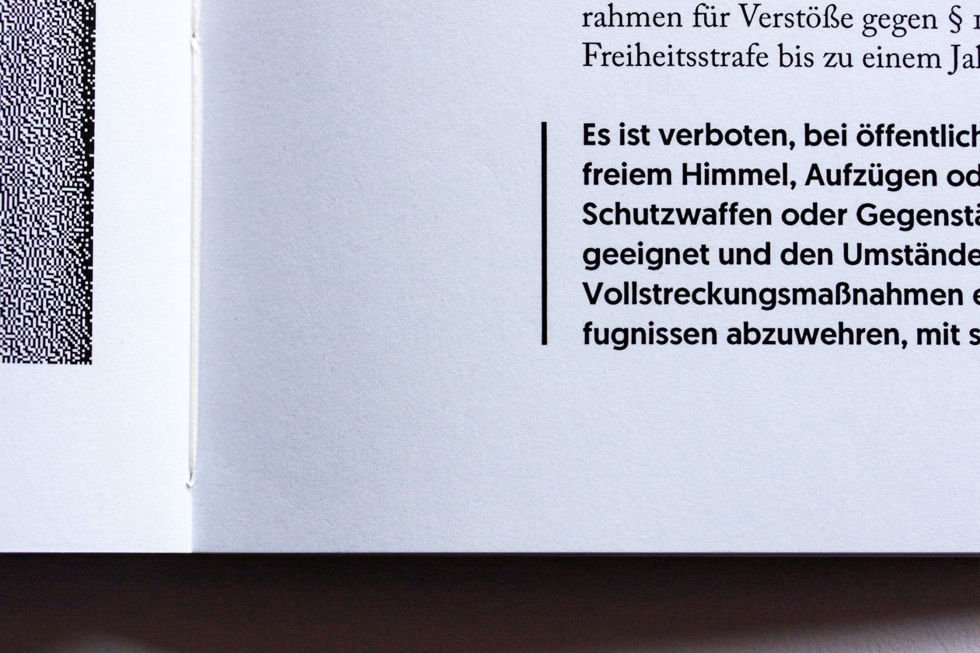The use of colour throughout the book is restricted to black on white.This limited colour scheme sym- bolises black and white thinking, is not politically charged, and is strongly associated with text, the prevalent visual representation of language.