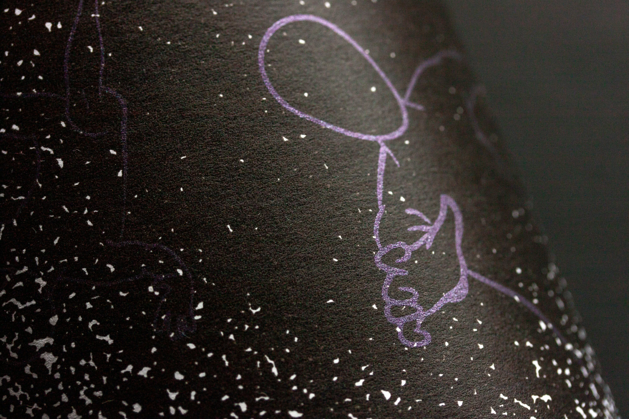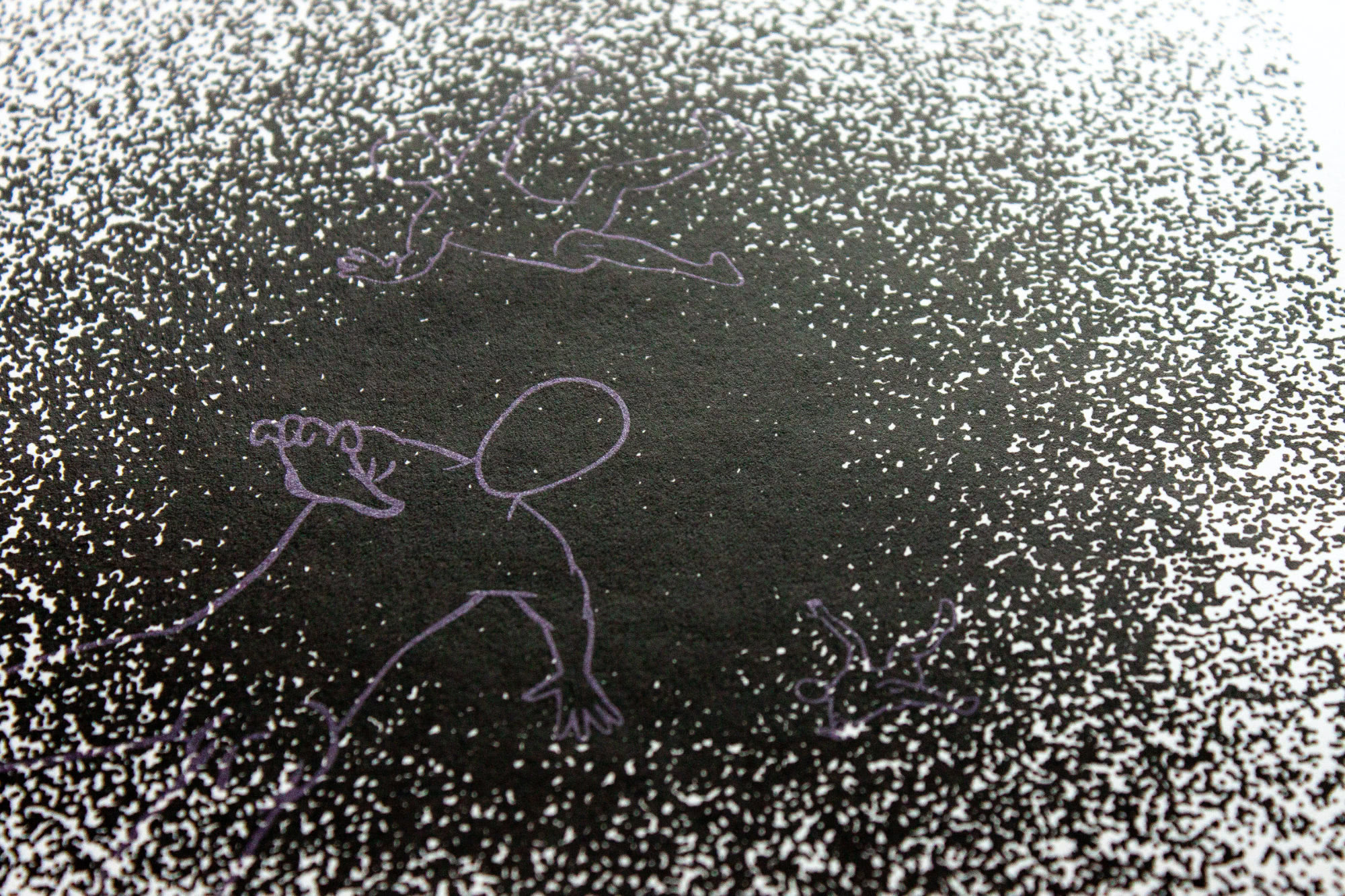 In contrast to the black hole the figures are made to seem fragile and helpless. They are printed with interference colour, making them only visible from certain viewpoints. Struggling to get the figures’ perspective right, I used 3D models in Blender to create reference images, which I then traced in a vector graphics software.